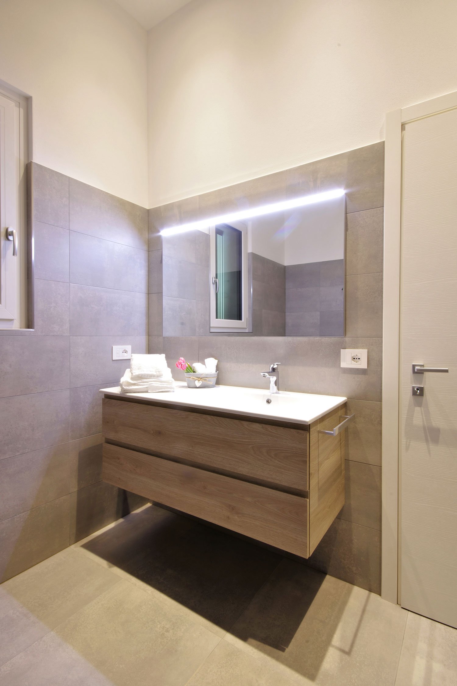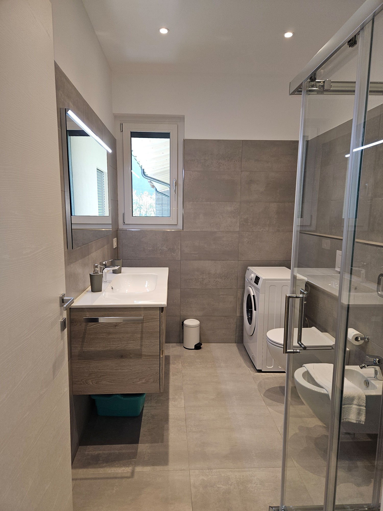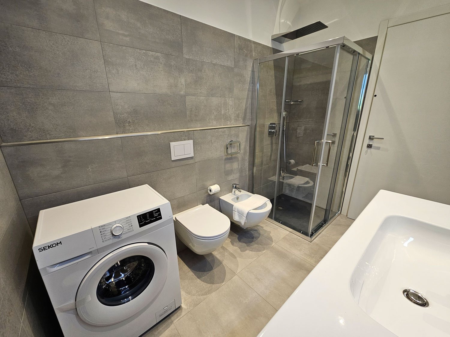 Camera matrimoniale con bagno interno e una camera con due letti singoli. I due bagni sono entrambi dotati di moderna cabina doccia a pioggia, WC, bidet e lavandino. Un bagno è dotato di lavatrice.