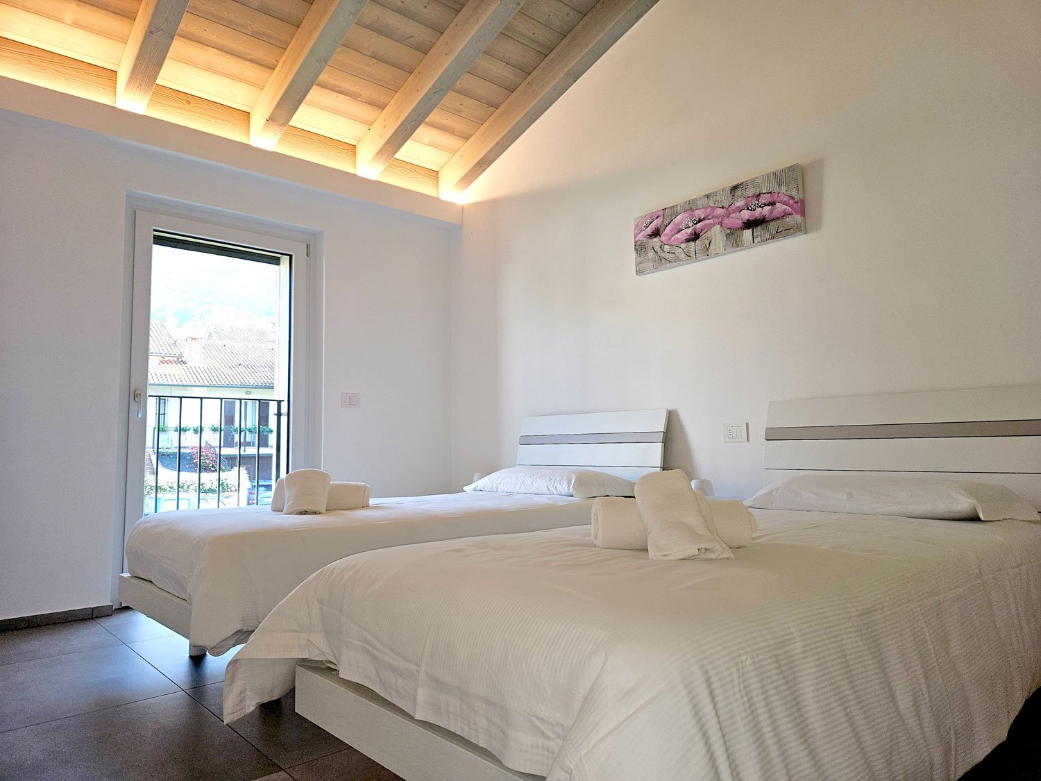 Appartamento con splendida vista lago dal terrazzo coperto. Aria condizionata canalizzata d’ estate e riscaldamento a pavimento d’inverno. Wi-fi. Ideale per coppie o famiglie numerose, massimo 6 posti letto. 1 Posto auto coperto esterno. Piscina condivisa a pochi passi.