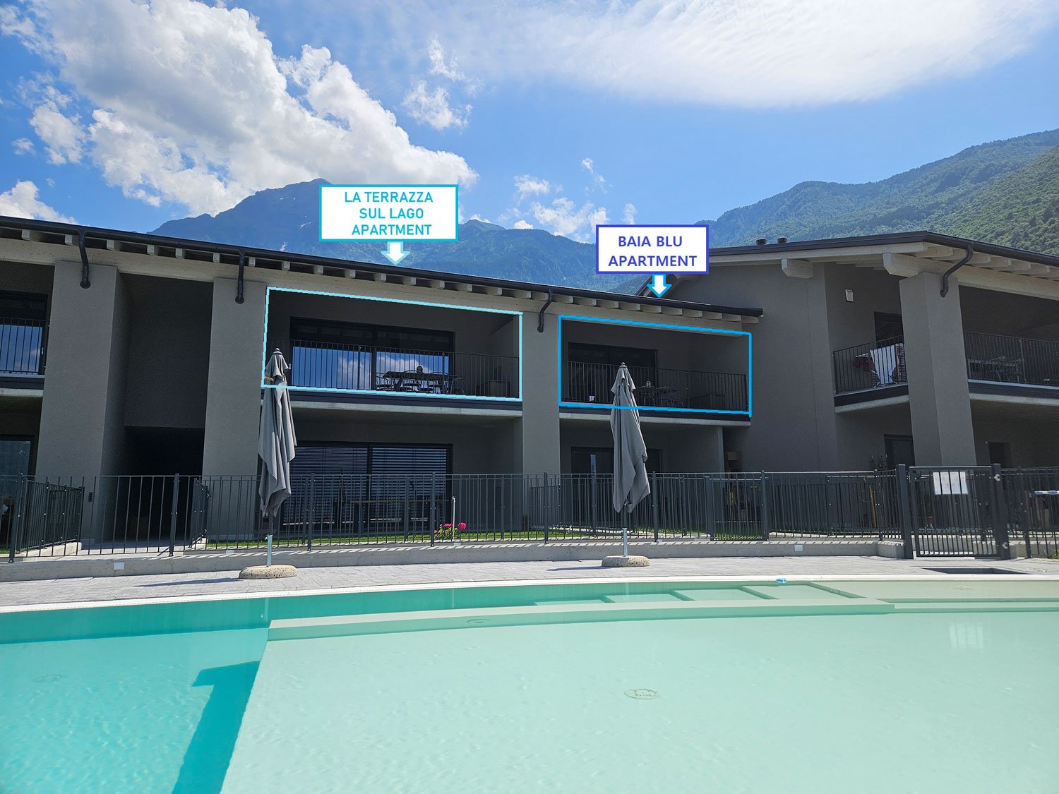 Terrazza solarium in condivisione con gli altri appartamenti del residence, disponibile con lettini, ombrelloni e una rinfrescante piscina con vista lago aperta tutti i giorni dal 1° maggio all'inizio di ottobre.