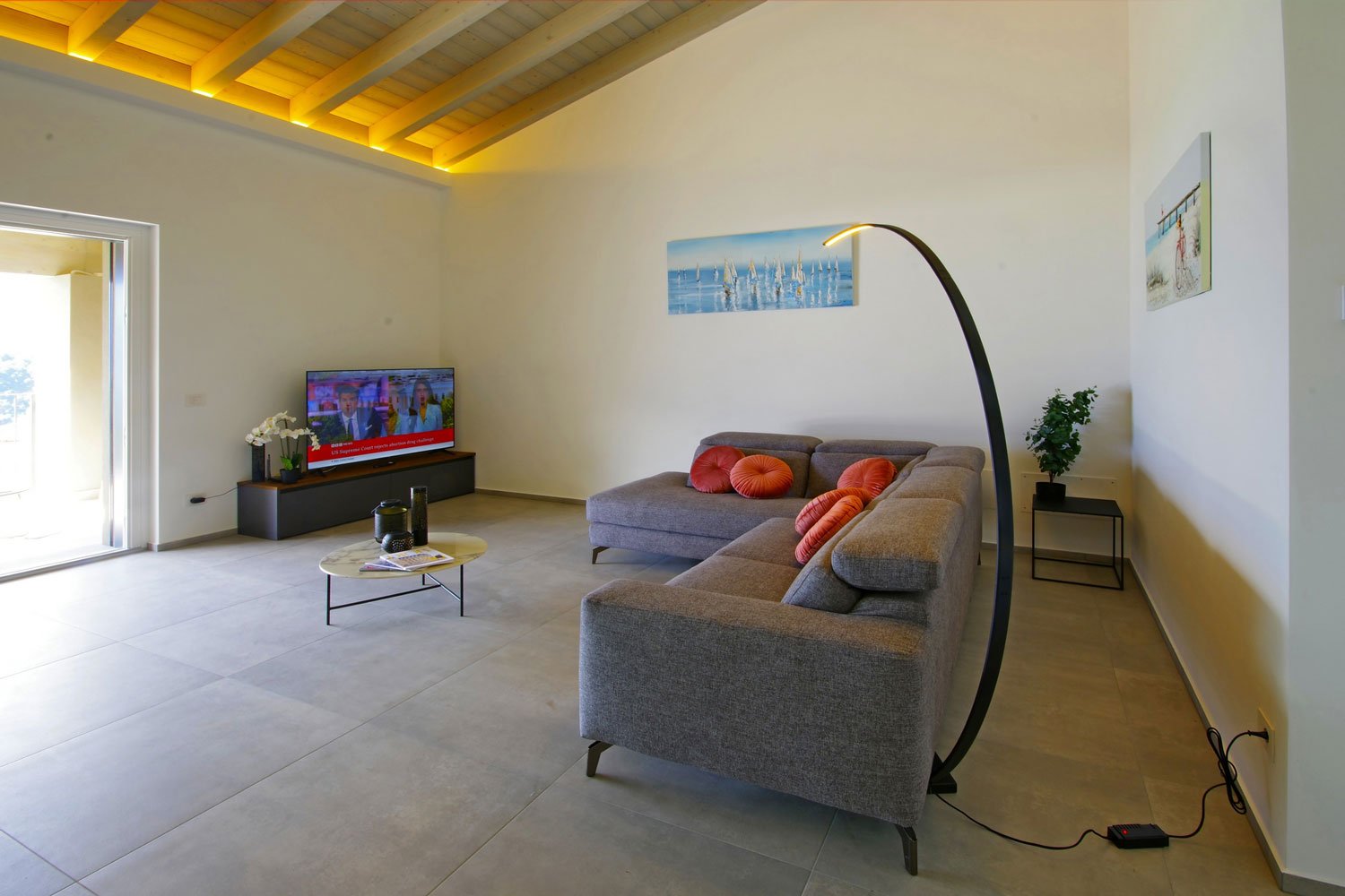 La zona giorno dispone di un comodo divano ad angolo con smart TV, Wi-Fi e un moderno tavolo da pranzo in legno.