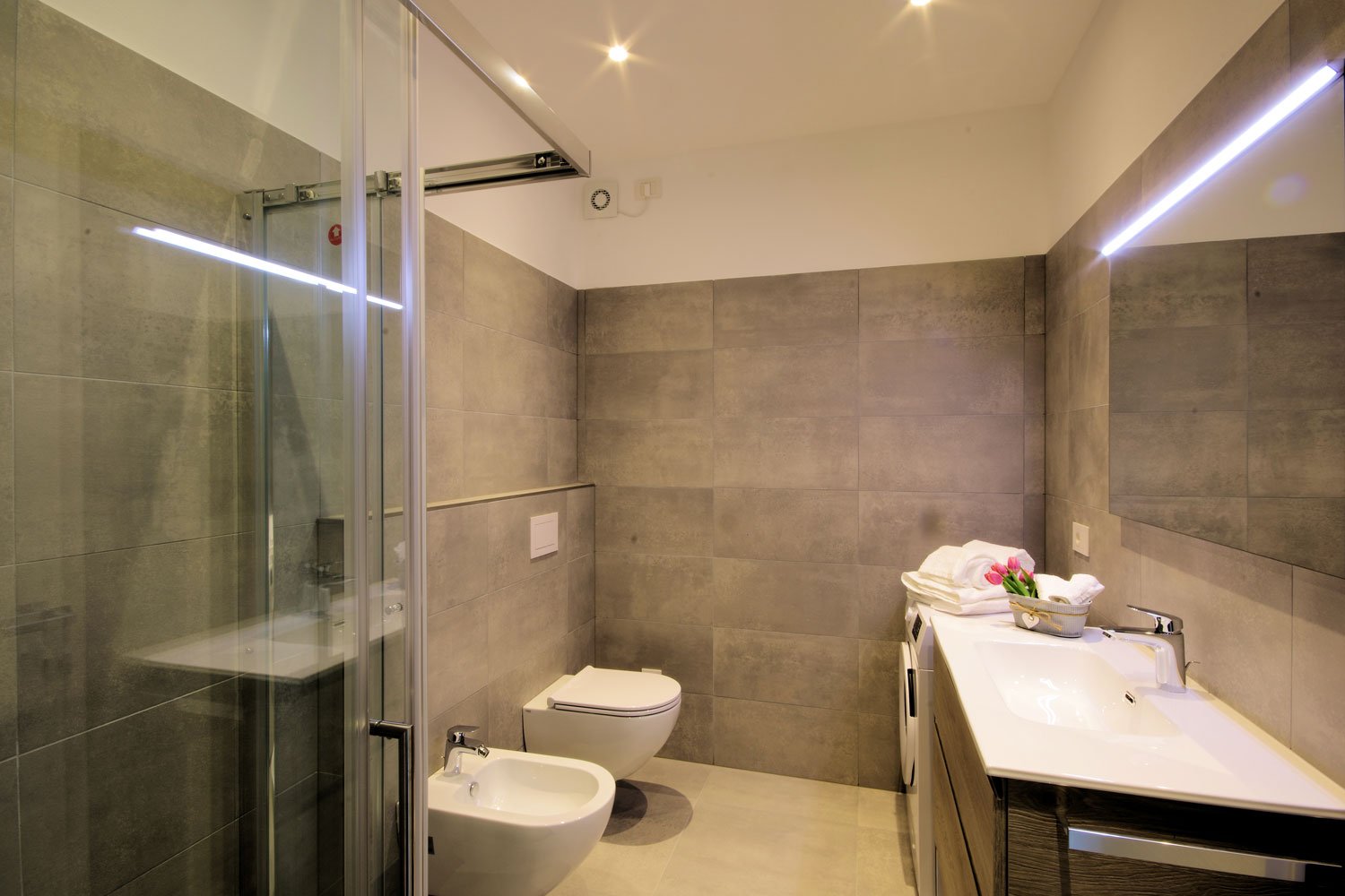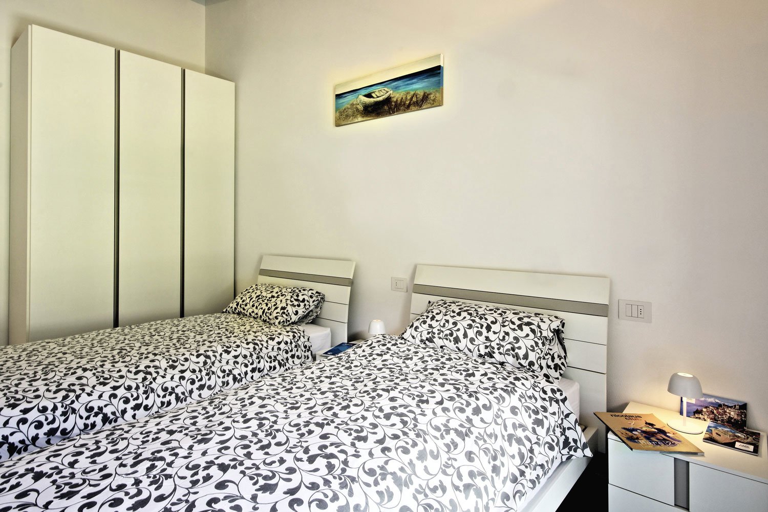 Una confortevole camera matrimoniale con armadio e cassaforte, bagno privato con doccia, camera con 2 letti singoli, un altro bagno con moderna doccia a pioggia e lavatrice.
