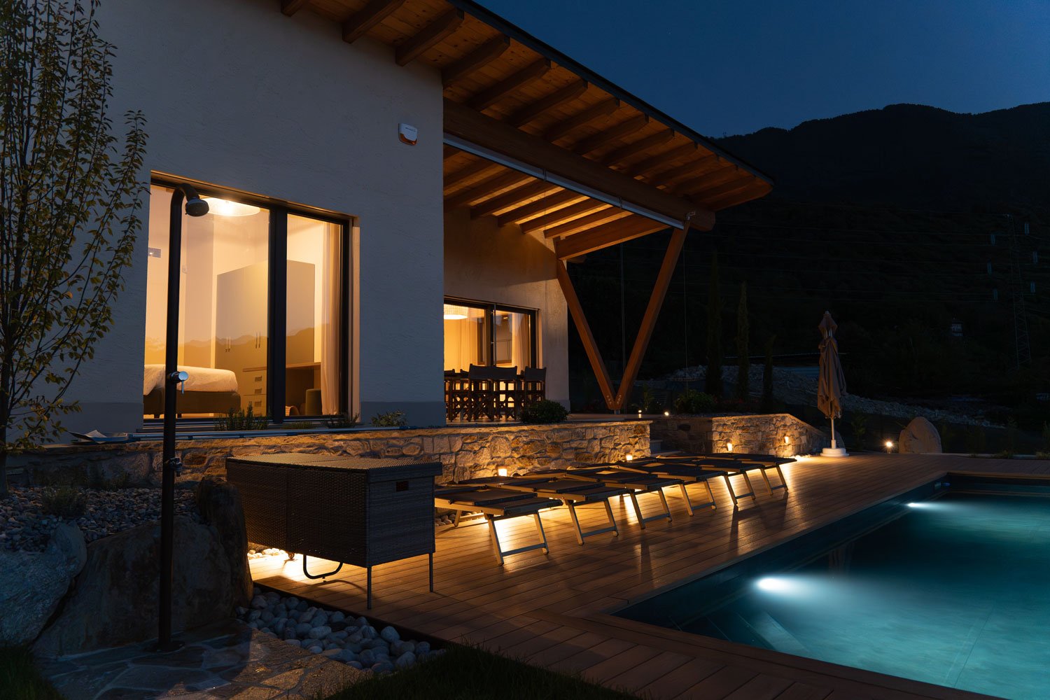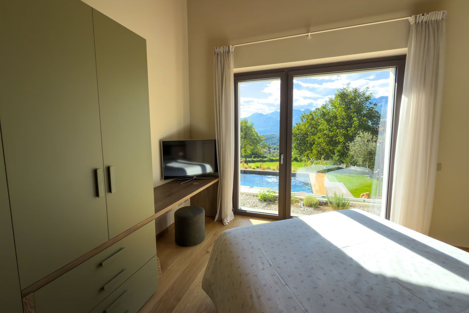 La camera da letto principale, progettata con finestre panoramiche sulla piscina, con TV e bagno moderno con doccia, ti permetterà di rilassarti guardando le montagne e la piscina.