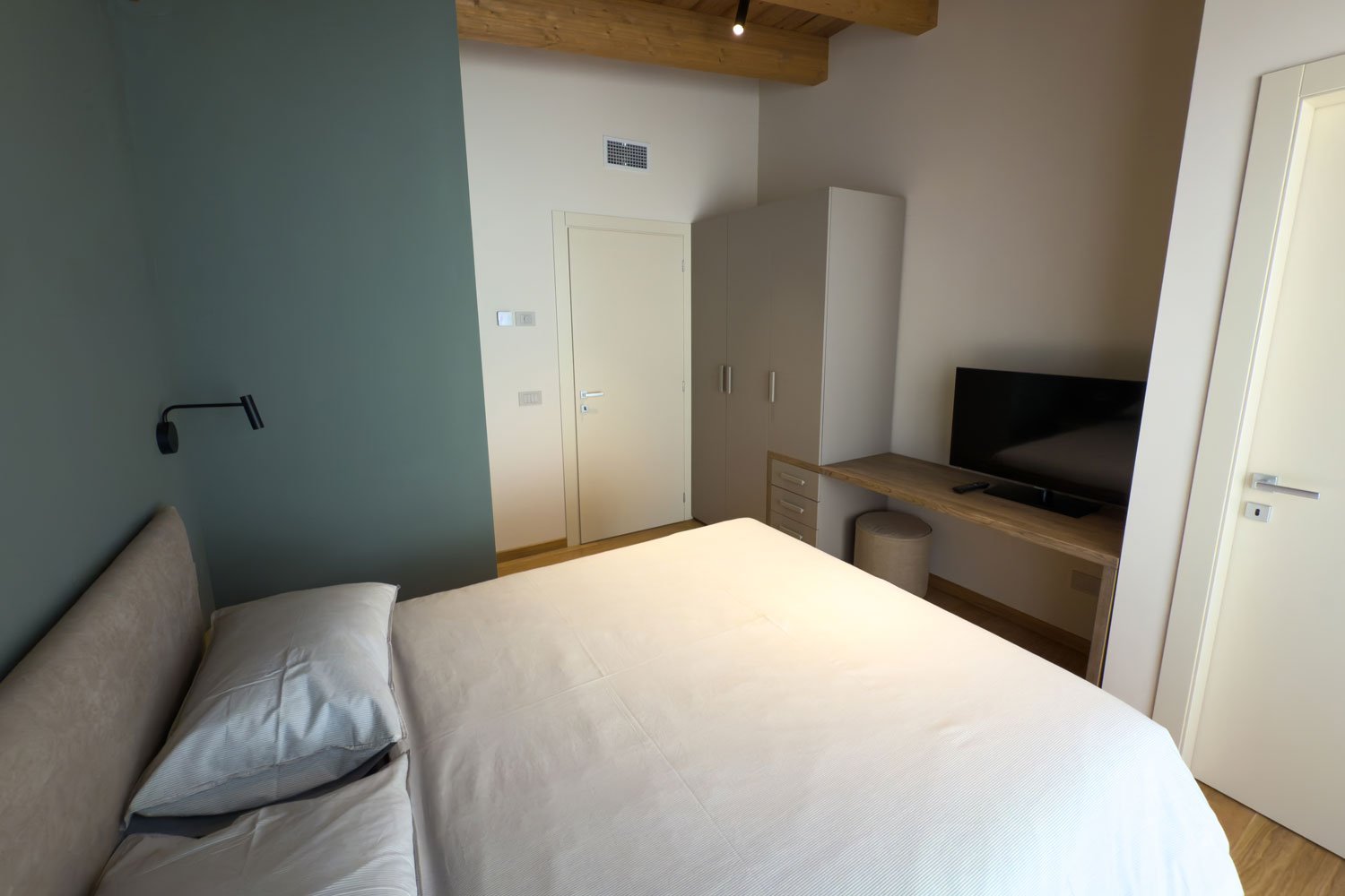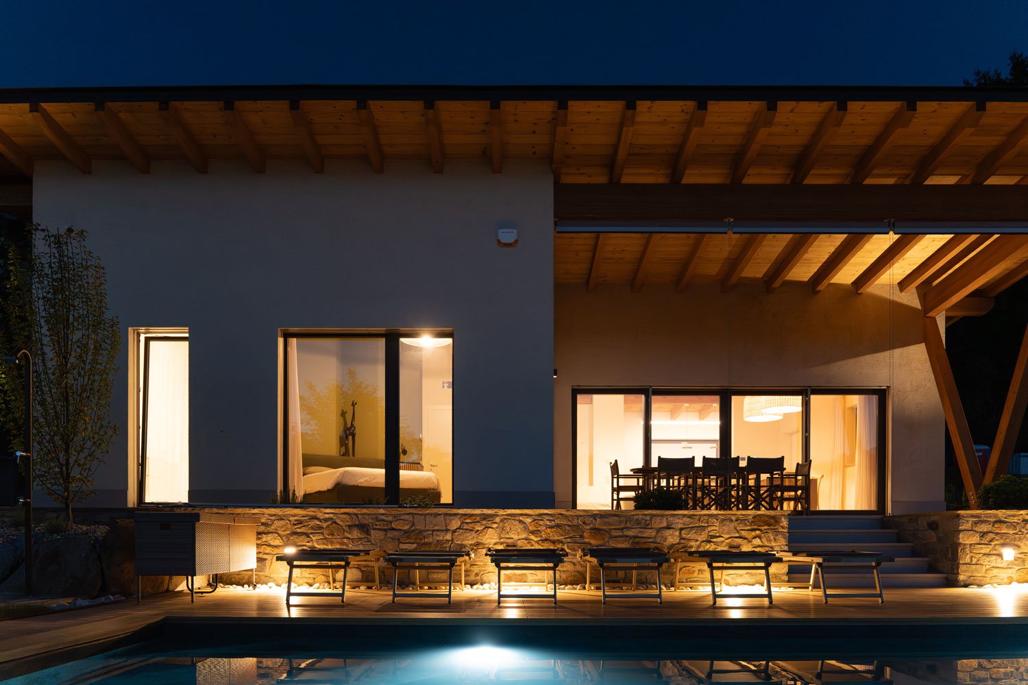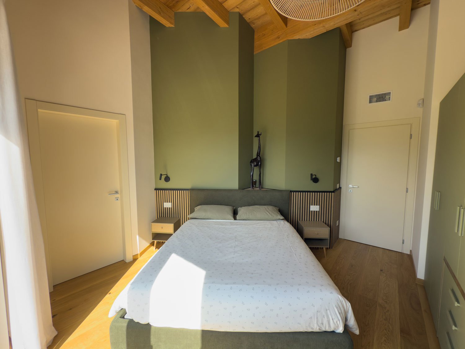 La casa dispone di 4 camere da letto (2 matrimoniali e 2 con 2 letti separati) e 4 bagni (3 sono en-suite) arredati con elementi di design moderno e soffitto in legno a vista.