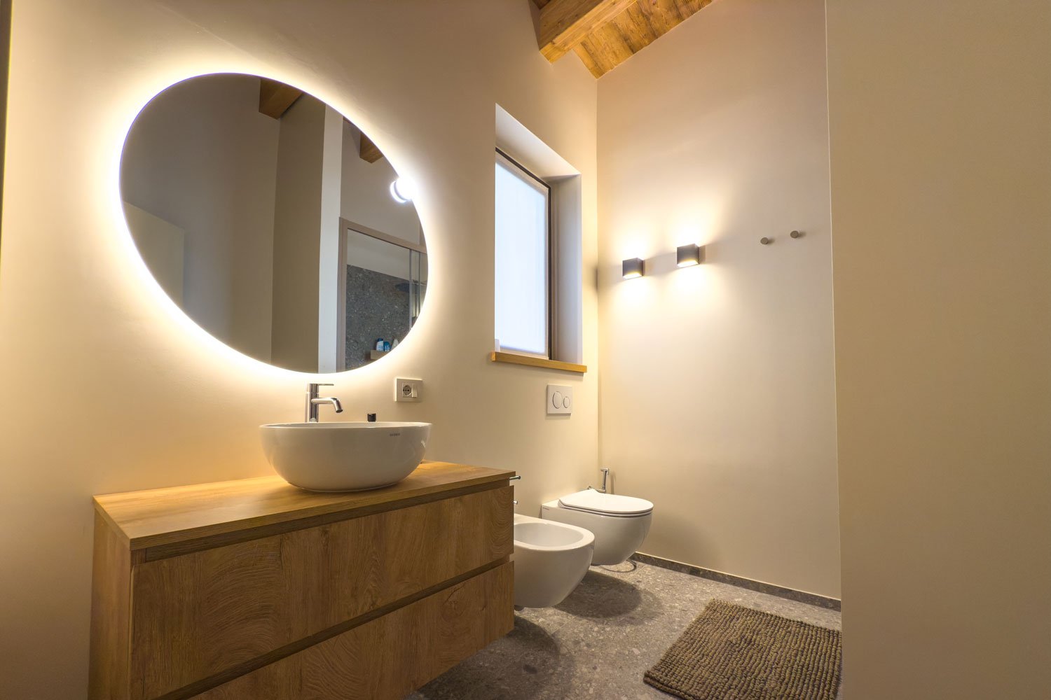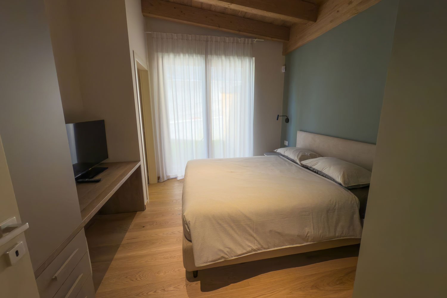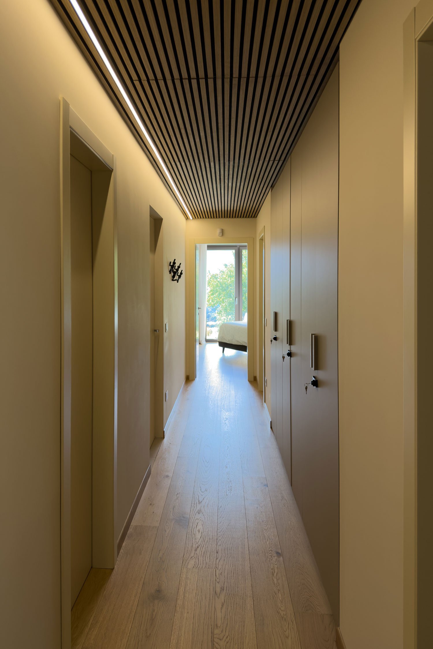 La casa dispone di 4 camere da letto (2 matrimoniali e 2 con 2 letti separati) e 4 bagni (3 sono en-suite) arredati con elementi di design moderno e soffitto in legno a vista.